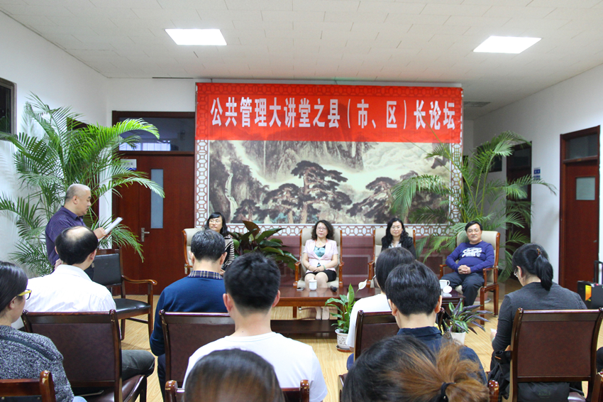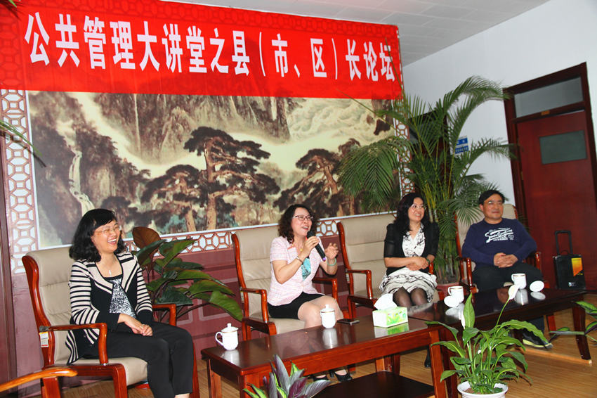 5月4日,应张红凤院长邀请,青岛市李沧区副区长孙晋华,济南市槐荫区副区长印东,淄博市沂源县副县长李玲,淄博市周村区副区长李寅萍出席公共管理大讲堂之县(市、区)长论坛。论坛由体育论坛