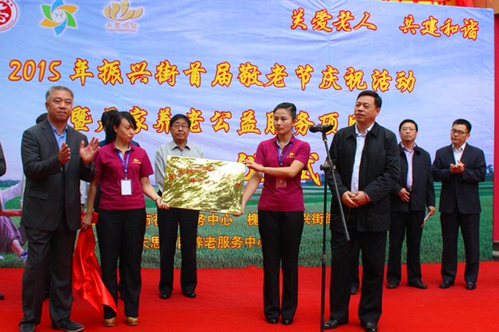 与济南市槐荫区振兴街办事处、济南天思国际养老服务中心在“2015振兴街首届敬老节”上举行签约揭牌仪式,共建“劳动与社会保障研究暨专业人才培育基地”。