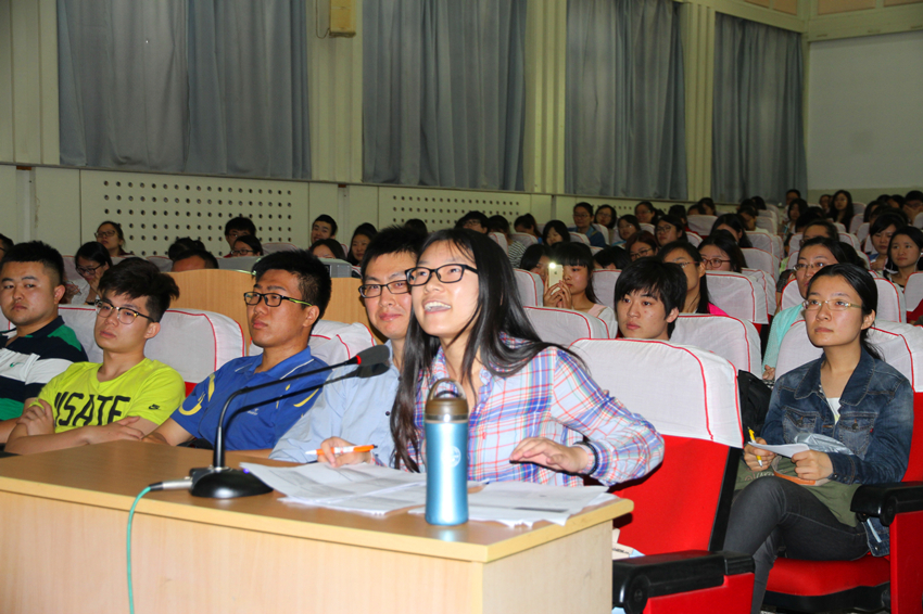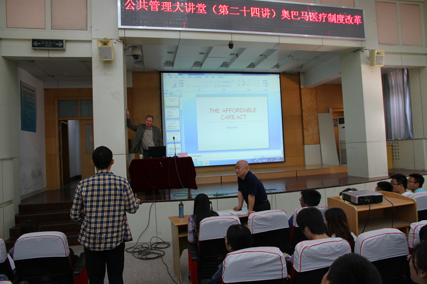 结束后,现场同学用英语提问,与 Peter E. Hilsenrath教授交流平价医疗法案对州政府财政的影响以及是否会因为总统的更替使该法案流于形式。本次活动受到校国际交流与合作处的大力支持,既活跃学术思想,开阔了视野,同时锻炼了学生的英文听说读写能力,受到广大学生的好评。