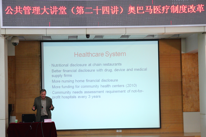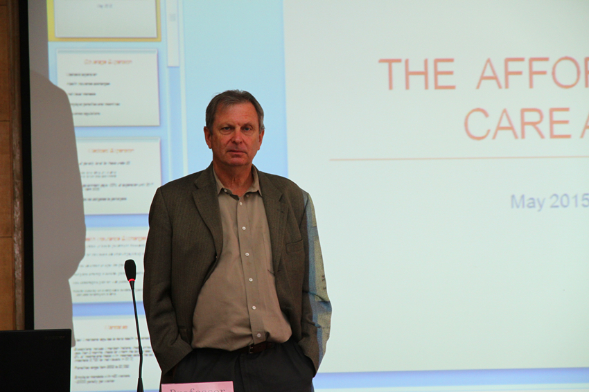 Peter E. Hilsenrath教授主要讲述了3部分内容。第一部分的报告内容为美国医疗卫生的有效性和可持续性发展。第二部分的报告内容为美国平价医疗法案即奥巴马医疗制度改革。第三部分的内容为美国加州太平洋大学MAcc、和 MBA项目做推介。