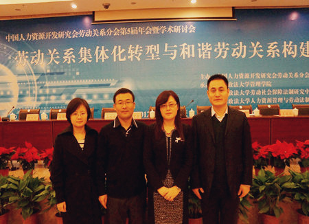 张红凤院长、路军副教授、贾海彦副教授和焦霄黎博士分别作了题为“我国职业安全规制困境与多中心治理框架下的解决路径”、“罢工潮传导机制研究——以2010年中国罢工潮为例”、“劳动关系方向在劳动与社会保障专业中的定位与发展——基于公共管理类人才培养模式视角”和“企业劳动关系和谐度评价指标体系研究”的报告。路军副教授(合作)提交的“劳工三权实现的政治空间——地方政府与工人抗争的互动”论文荣获年会优秀论文三等奖。