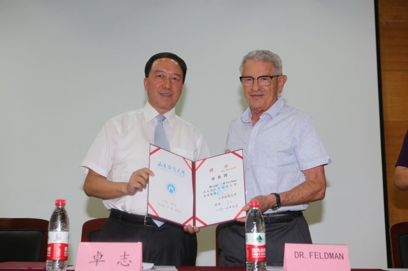 的多次邀请表示感谢,对此次和Feldman教授一起来到山东财经大学表示非常高兴。他希望为山东财经大学的学科建设、科学研究和人才培养等工作尽一份力量。Marcus W. Feldman教授表示,非常仰慕儒家文化,对孔子一生有三千弟子、七十二贤人非常敬佩,希望能够像孔子一样培养更多的学生和人才,愿意为山东财经大学的人才培养做出贡献。