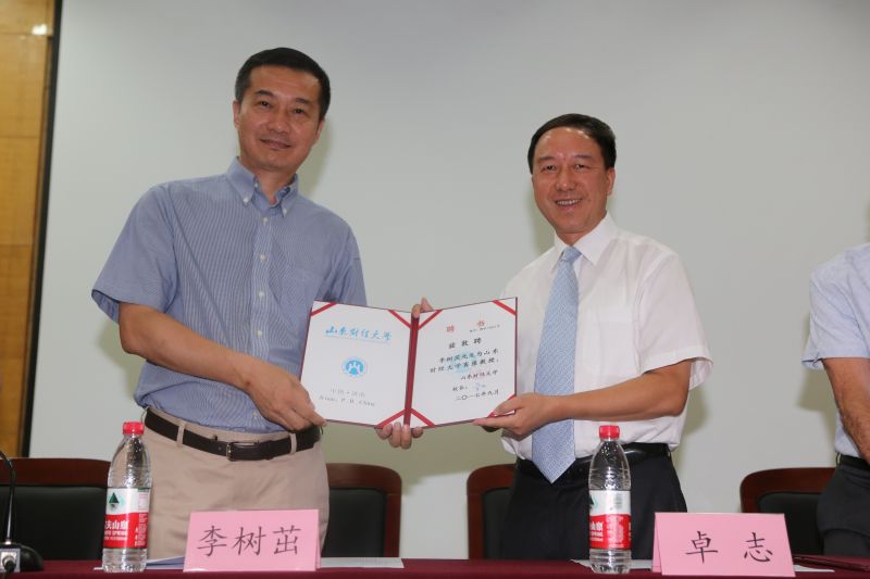 受聘仪式上,张红凤院长首先介绍了出席仪式的领导和嘉宾,并详细介绍了Feldman教授和李树茁教授的学术业绩、山东省的经济文化优势、山东财经大学以及公共管理学科的发展历程和建设成绩。随后,卓志校长向两位客座教授的到来表示欢迎,并向两位教授颁发了“公共管理学科客座教授”的聘任证书。李树茁教授做了受聘感言。