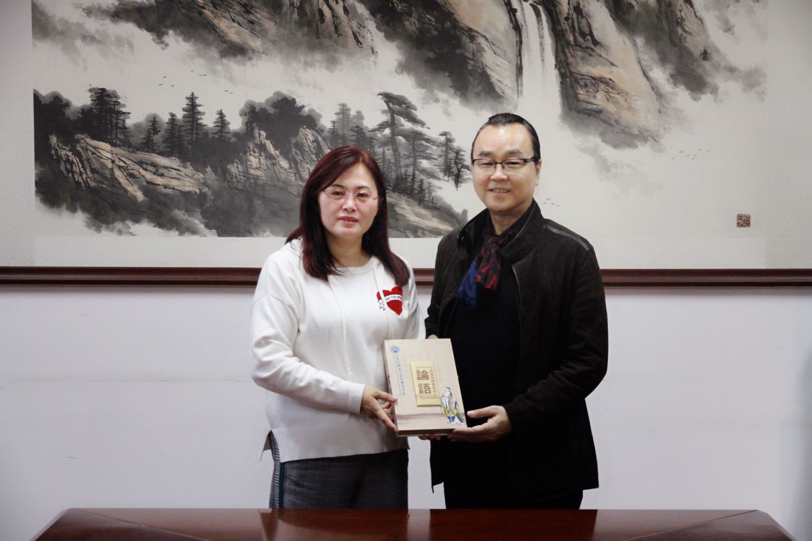 张红凤院长、贾海彦副院长及部分老师进行了座谈,就西方美学在公共文化服务中的应用等热点问题展开了讨论,为公共服务管理和服务水平提升等相关研究打开了新的思路,提供了新的视角。座谈后,张红凤院长代表学院全体师生向李健仪教授赠送了《论语》经典读本并合影留念。