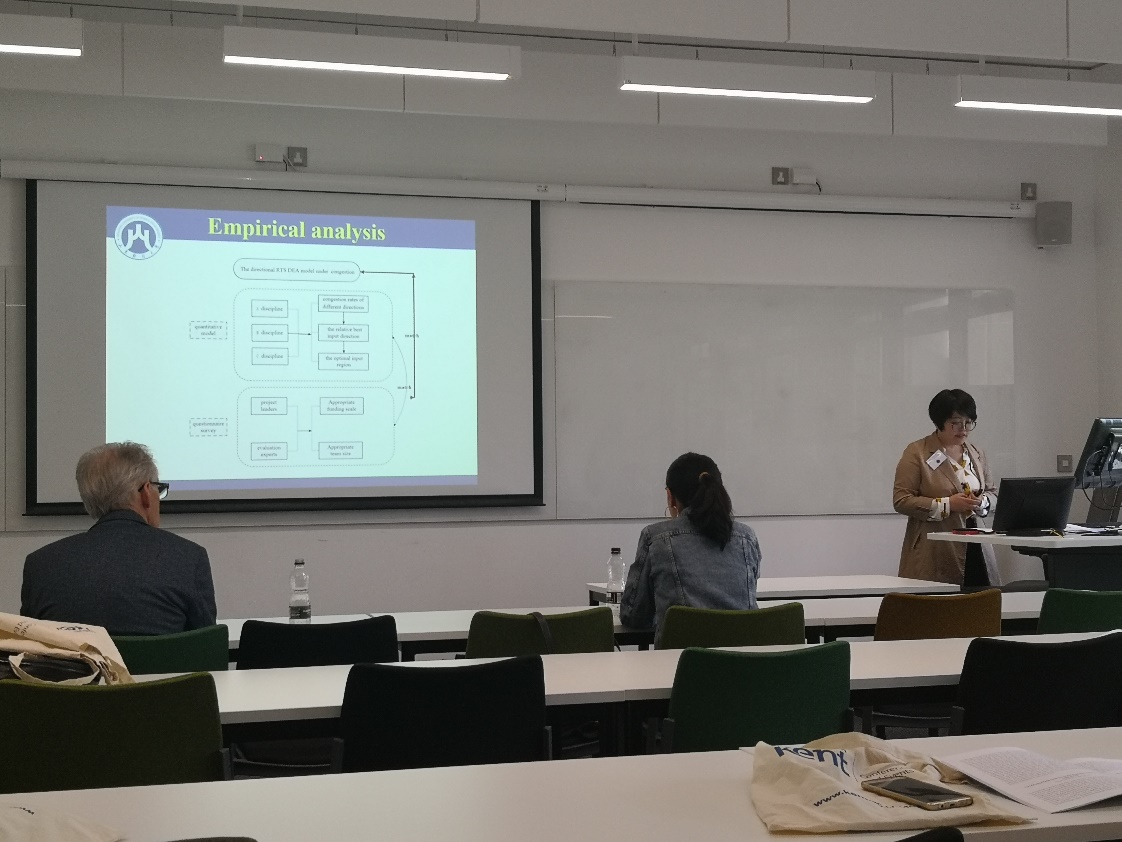 本次会议分为大会报告和分会场报告两部分组成。在大会报告中,首先由大会主席英国肯特大学的首席教授刘文斌教授以及商学院院长Martin Meyer教授做了大会欢迎致辞,然后DEAIC主席Joe Zhu教授做了数据包络分析在大数据应用下的报告,最后由DEA创始人之一的Wade Cook教授做了数据包络分析前沿进展的报告。分会场报告主要分为数据包络分析理论发展与应用分析两部分。张红凤院长和段培新老师作了题为《Research on directional returns to scale of science funding program —Case Study of the General Program of NSFC》的报告。该报告是运用DEA方法对科学基金进行实证分析,通过构建符合科学基金资助特点的DEA模型,并对中国自然科学基金面上项目进行了实证分析。