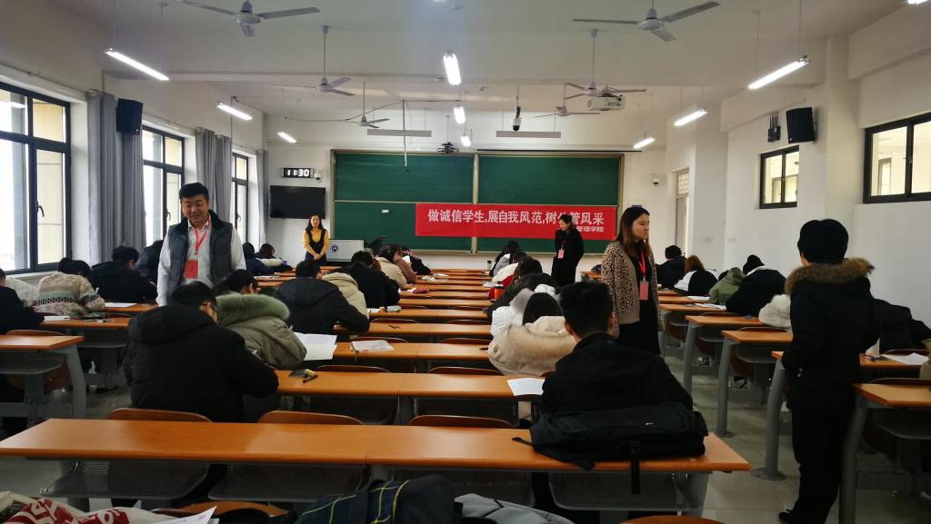 考前严把试题质量关,充分做好各环节试卷保密工作;分别召开教师和学生动员大会,对全体监考教师就考试安排、监考要求等进行培训;对学生开展考风、考纪教育,以班级为单位签署《诚信考试承诺书》,考场悬挂诚信考试主题标语,营造诚信考试氛围。