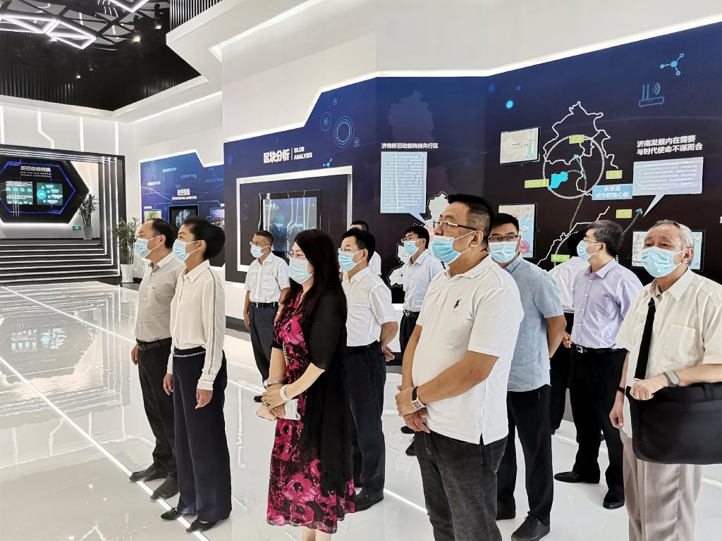 调研组一行实地考察了新旧动能转换先行区,在先行区城市展厅,直观了解济南新旧动能转换区总体规划和绿地国际博览城项目建设情况;在中科新经济科创园,听取科创园规划建设和中科院工程热物理所、高能物理所、计算所项目落地情况汇报,深入考察高端装备制造业的前沿发展动态。在随后的座谈会中,济南新旧动能转换先行区管委会的主要部门人员具体介绍了先行区有关工作开展情况,调研组专家学者针对先行区战略叠加、合村并居、黄河生态保护、产业发展等问题进行了讨论与交流。