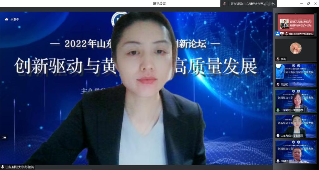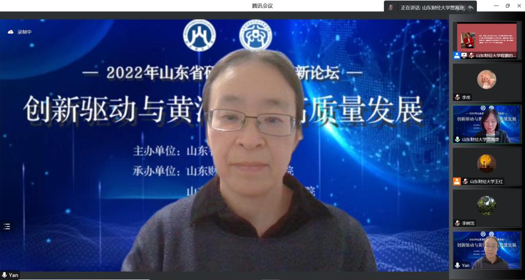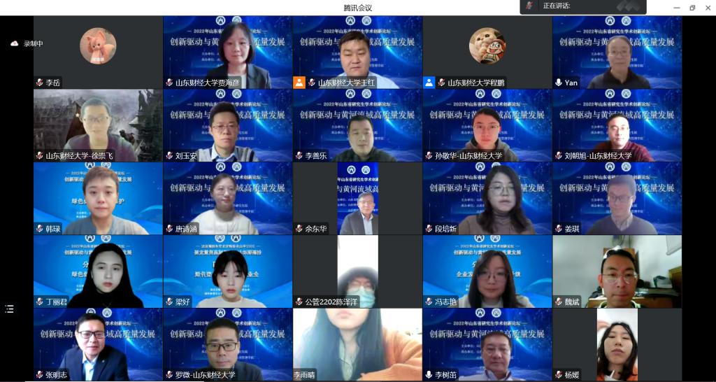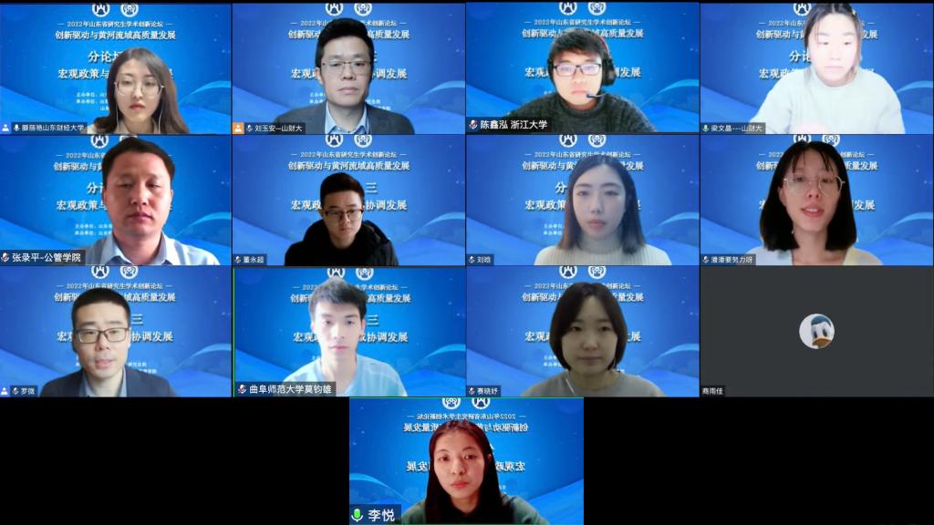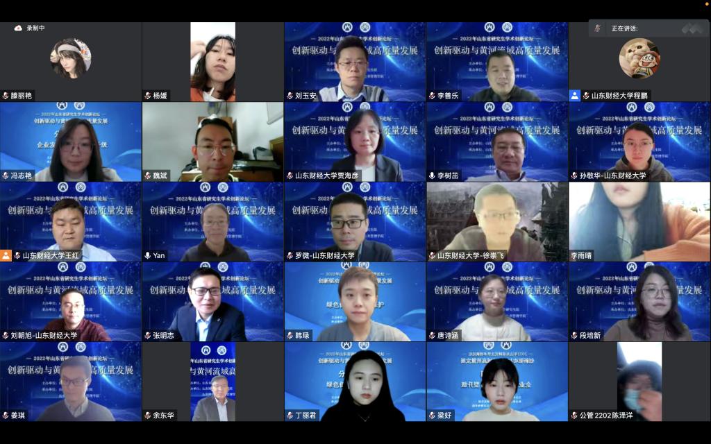 本次论坛通过线上方式进行,以“创新驱动与黄河流域高质量发展”为主题。来自西安交通大学、美国北卡罗来纳大学、中国人民大学、山东大学、山东社会科学院等高校与科研单位的专家学者,来自北京大学、浙江大学、复旦大学、山东大学、中国财政科学研究院、中国矿业大学、上海财经大学、山东财经大学、南京审计大学、安徽财经大学、江西财经大学、山东师范大学、曲阜师范大学、南京财经大学、山西财经大学等高校与科研单位的专家学者、研究生共计200余人参加了交流讨论。