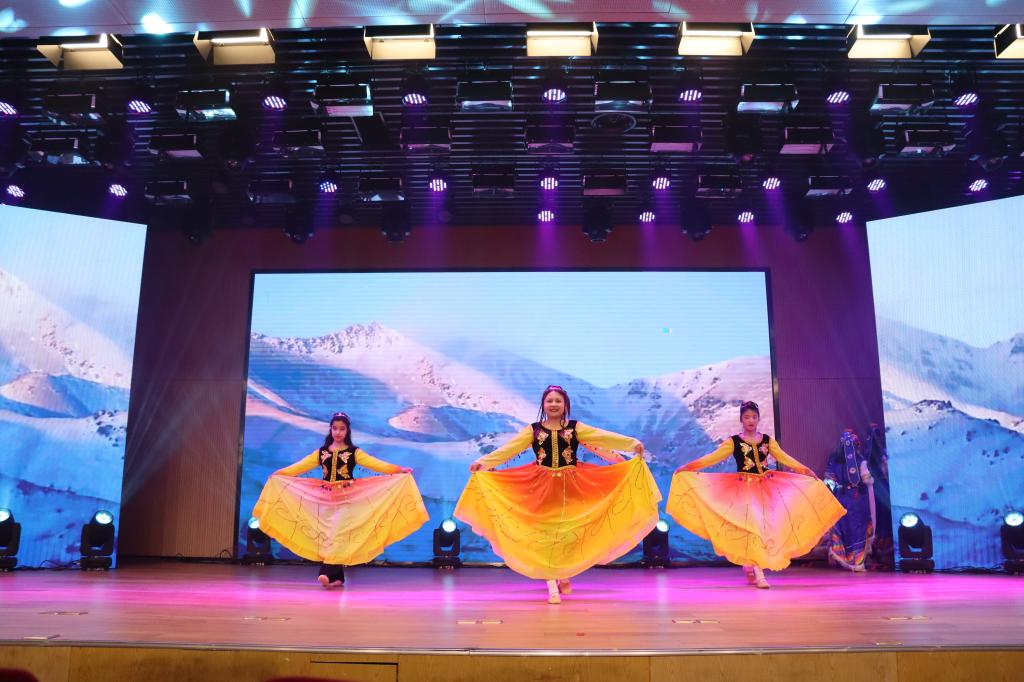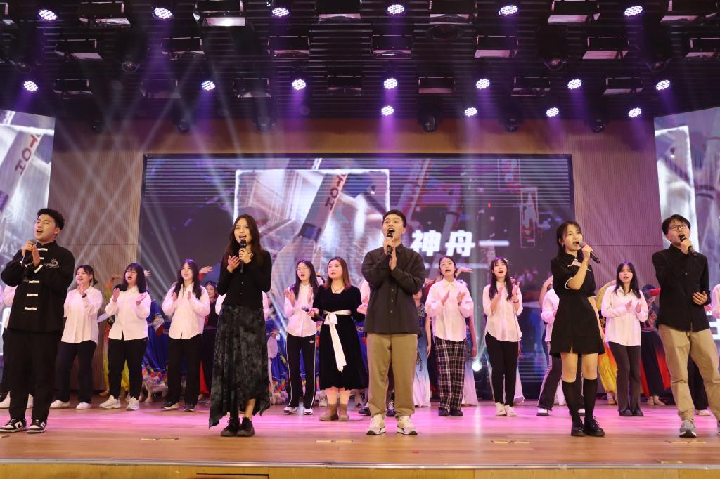 晚会来到第三章:春和。相声《双字意》,2022届优秀校友陈广昊与两个搭档一捧一逗,将我国国粹融汇进诙谐的逗趣中,生动有趣,现场欢声笑语不断;民族大联欢《美丽中国》,民族舞者们身着各具特色的民族服饰,在激昂澎湃的歌声中翩翩起舞,婀娜的身姿宛若一朵朵绚烂绽放的民族之花。最后,晚会在大合唱《相亲相爱》的亲切旋律中圆满落幕,演唱者们的歌声沉稳与奔放并存,传递给同学们希望与爱意。