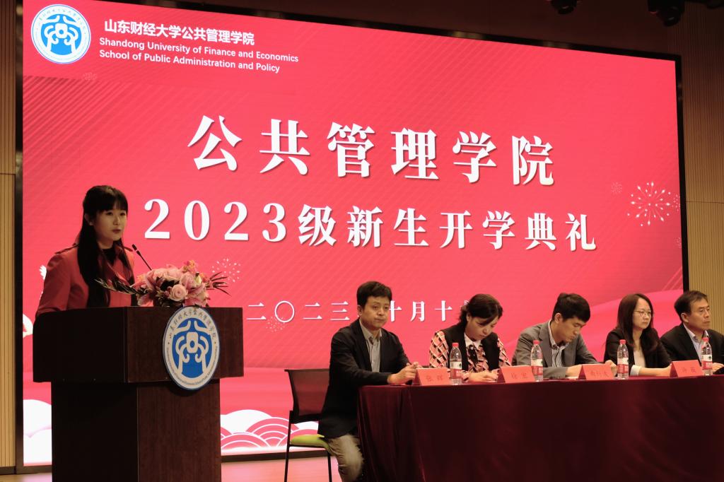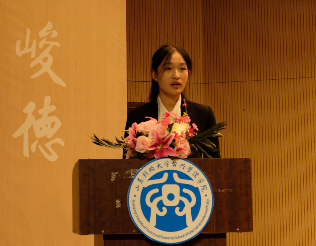 2023级新生孙熙晨作为新生代表发言。她在致辞中娓娓道来与山财大的结缘故事,勉励大家共同遵守学生准则,端正学习态度,锻炼个人能力。