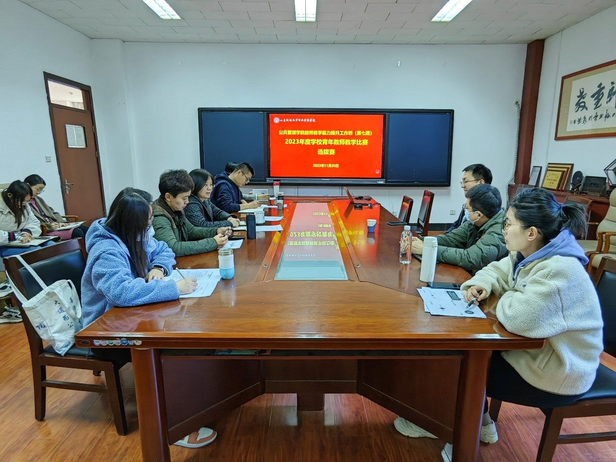 教师教学能力提升工作坊(第七期)成功举办,本次工作坊的主题为“2023年度学校青年教师教学比赛选拔赛”。院长贾海彦、副院长罗微、城市与土地资源管理系主任韩琭、劳动与社会保障系副主任闫绍华、政府管理系副教授冯志艳担任评委,全体参赛教师以及本年度新入职教师参加。