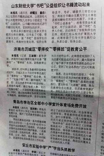 “书吧”社团公益组织,该社团通过书籍中转的形式,通过在校学生的无偿捐赠和收集毕业生遗弃书籍,实现回收再利用,由支教大学生在暑期捐赠给贫困地区的孩子,并建立公益基金将售书资金积累起来,用于公益活动。此项活动自开展以来,得到了社会各界及学校师生的广泛关注,近日,《山东教育报》对体育论坛