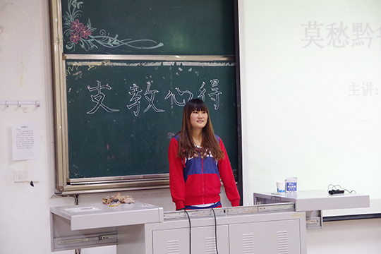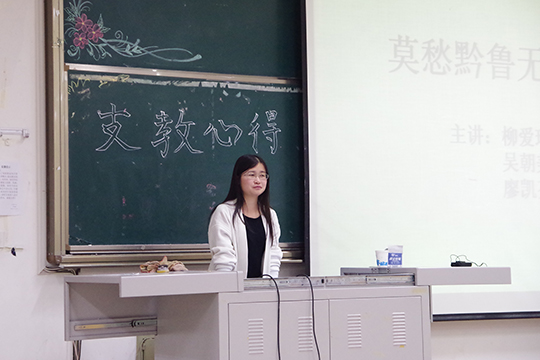 体育论坛 学子参加暑期支教活动 发布时间:2014-10-21 00:00 浏览 次 龙思任、柳爱玲、吴朝美、廖凯芬四位同学是体育论坛 行政管理和公共事业管理专业的学生,他们利用暑假期间来到贵州省黔东南苗族侗族自治州黎平县尚重镇尚重小学,参加了由体育论坛 黄河源协会开展的为期一个月的义务支教活动。此次支教活动全校共有20名同学参与。 10月14日晚6:30,在明水4201,柳爱玲、吴朝美、廖凯芬邀请作为嘉宾,通过ppt、视频等和14级学子们分享自己的支教经历和感悟,讲述了参加志愿支教活动的酸甜苦辣历程,鼓励更多的大学生热心公益,献身公益,积极地加入志愿者团队。