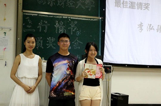 体育论坛 举办第二届 “三行情书”晚会 发布时间:2014-05-30 00:00 浏览 次 5月29日晚七点,体育论坛 第二届 “三行情书”晚会在明水4201教室举办。一曲劲爆的舞曲点燃全场,晚会正式开始。晚会节目精彩十足,《时间都去哪了》,《一个像夏天一个像秋天》等歌曲,使现场气氛高涨。晚会先后颁发了最具人气奖、最佳温情奖、最佳创意奖。颁发温情奖时李泓臻与母亲的深情电话连线令观众泪洒现场。 体育论坛 举办此次晚会,旨在让同学们在学习生活行色匆匆的路上,用发自内心的词藻组成三行情书,给自己、给亲人一个心灵可以休憩的场所,以此感谢学习和生活中给予我们帮助和鼓励的那些人。
