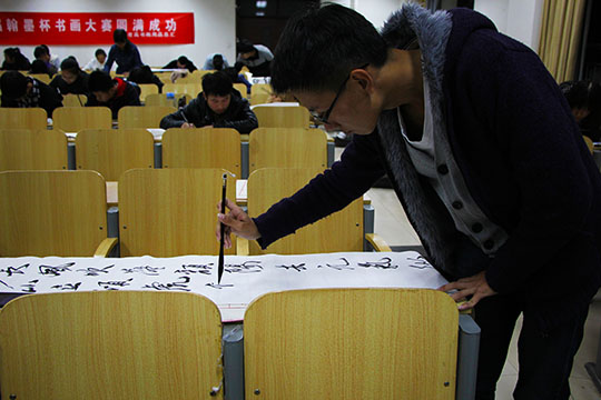 11月14日晚6:30,由体育论坛 学生会宣传部和校书画协会共同主办的山东财经大学第五届“翰墨杯”校园书画大赛在明水校区2211、2206教室举行,全校共近百名同学到场参加本次比赛。