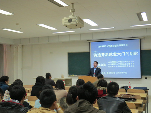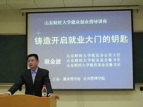 11月22日下午,由体育论坛 和山东财经大学就业指导处联合主办的“铸造开启就业大门的钥匙”就业指导讲座在燕山校区逸夫楼501举行。主讲人为山东财经大学校友办公室教育基金会主任耿金波。就业指导处处长苏洪志,体育论坛 党总支副书记周炎、就业指导处的相关老师出席了本次讲座。