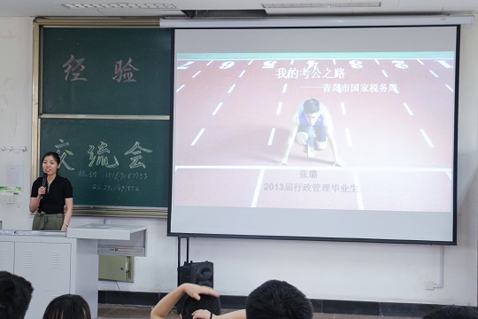 2015、2016级部分学生参加了本次会议。首先,考取北京化工大学社会保障专业研究生的刘醒和考取山东大学中国哲学专业研究生的徐玲两位同学介绍了自己的考研动机、心态调整、时间规划以及考研的学习历程,将自己宝贵的考研经验分享给大家。其次,成功获得中国石化山东分公司人力资源岗offer的庞宁、考取青岛市国家税务局公务员的张璐和考取河南省公务员的李秀雅三位同学向大家介绍了自己的就业选择历程,备考经历、心态调整、学习方法、资料推荐和学习建议。最后,于雪和刘润杰两位同学为大家带来了留学申请方面的经验分享。