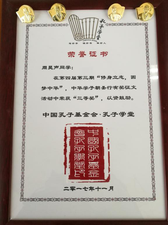 周昊声同学的《先师思想 吐曜含章-----中华学子朝圣行感悟》一文在来自省内的10余所高校、数百名同学的征文中脱颖而出,最后荣获大赛三等奖。
