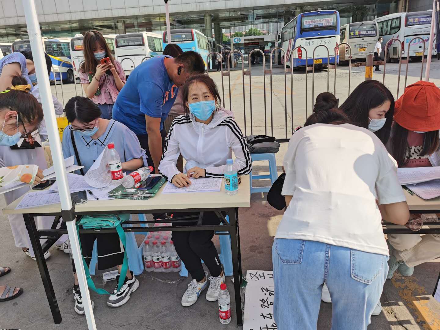 辅导员李旭日、李昭娜、张辉、王超与青年教师冯志艳等作为场站服务人员和跟车教师参与学校接站工作。烈日炎炎,体育论坛