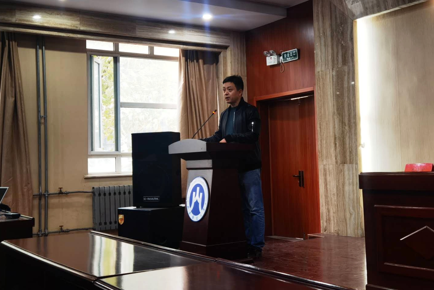 张辉老师宣布大会正式开始,并介绍与会嘉宾。首先,会议以视频和幻灯片的形式展示了第八届学生会的工作历程和工作总结。随后,第八届学生会主席李汝宏发言。他主要从“感恩、责任”和“秉承优良传统,创新发展工作”三方面展开了详细讲述,并以 “长风破浪会有时,直挂云帆济沧海”与第九届学生会成员共勉,祝愿学生会工作在新的一年里更上一层楼。