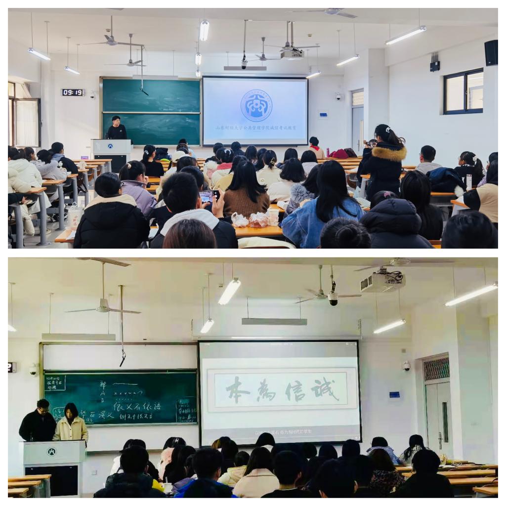 随后,各班班团组织学生观看诚信考试短片,视频中列举了关于考试作弊的典型事例,提醒同学们要考试纪律,要坚定信念,坚决抵制诱惑;还介绍了《国家教育考试违规处理办法》和《山东财经大学学生违纪处分条例(2020年修订)》中与考试作弊的相关条款,让同学们明确纪律红线,帮助同学们树立正确考试观念;分享了科学有效的复习方法,树立自主学习的意识,合理安排作息时间,端正考试态度,做到问心无愧,以一份合格的答卷来回报自己一学期的努力,考出水平,考出风采,共同营造学院优良的学风、考风。