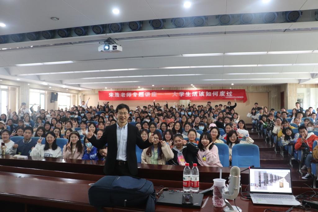 宋浩老师说:“我们可能会用大学四年的时间来怀念高中三年,但我们会用余生来怀念大学四年”。大学生活十分珍贵美好却又转瞬即逝,在青春韶华明确方向、脚踏实地是我们不断前行的基础。宋浩老师的专题讲座适时的给同学们带来了许多关于充实度过大学生活的建议,给同学们以很大的启发。整场讲座,宋老师风趣幽默,妙语连珠,同学们踊跃发言,掌声雷动。