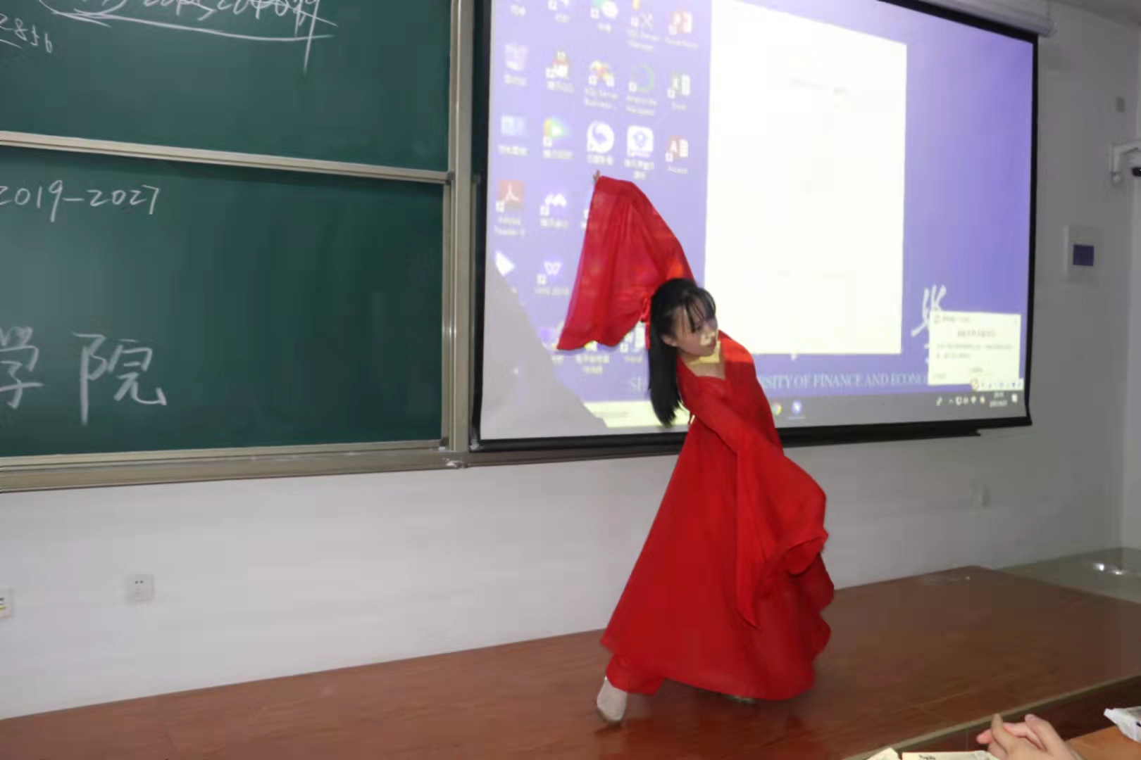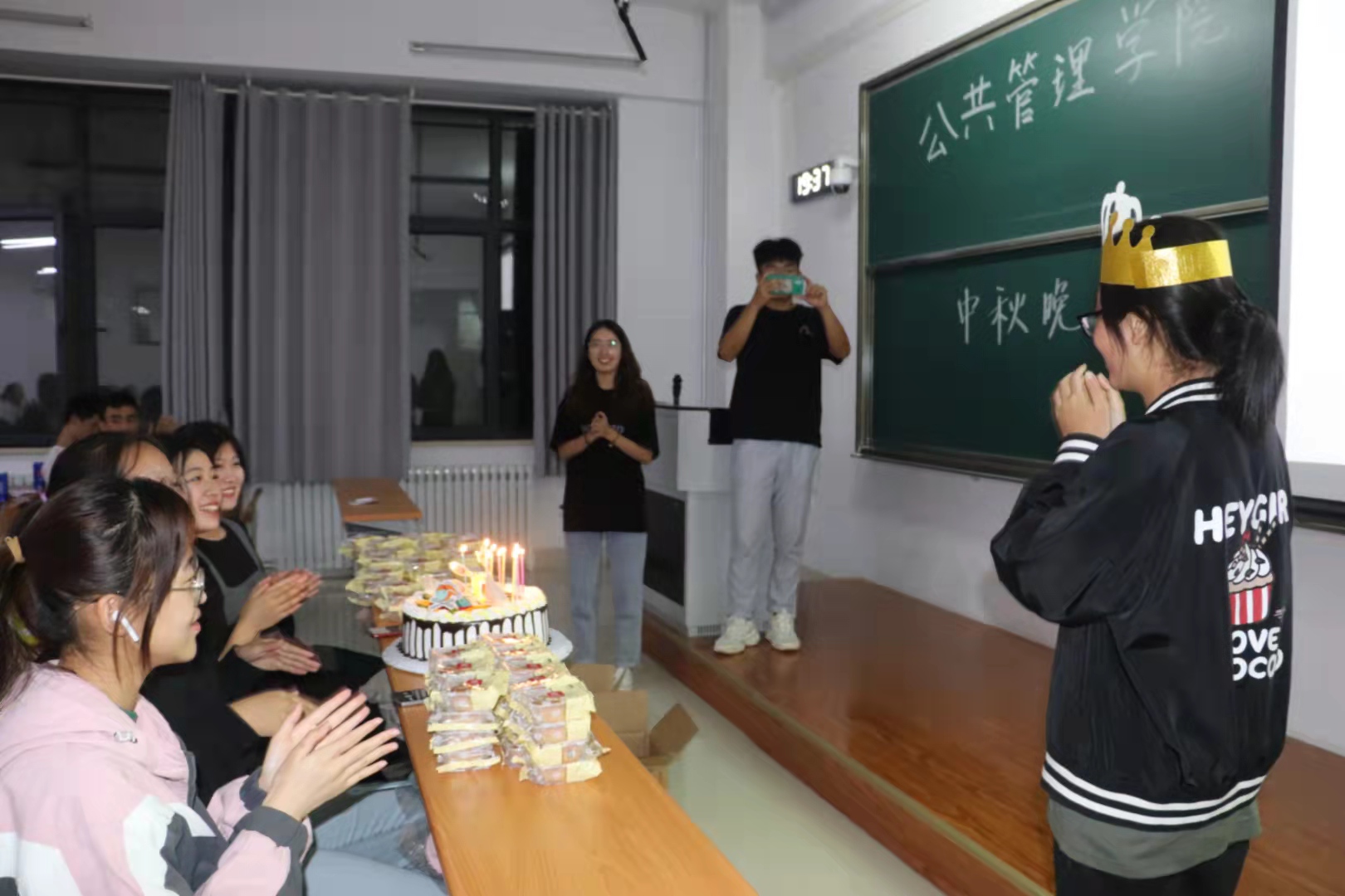 随后,伴随着生日快乐的歌声,大屏幕上出现了“欧维丹生日快乐”的字样,原来今天是公共管理二班一位女同学的生日,学院老师和代班为她精心准备了蛋糕和小礼物,“寿星”同学非常感动,现场气氛非常和谐。