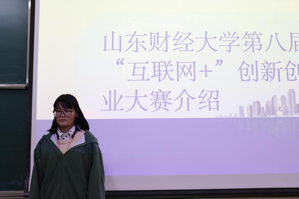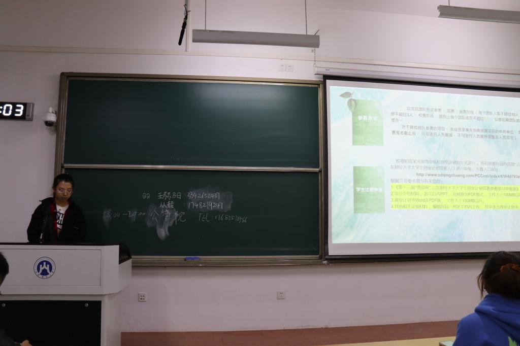 接着由科创部干事庞瑞华、游磊为我们介绍山东财经大学大学生创业计划大赛活动的具体内容。宣讲分为三个部分:赛程安排、比赛赛道、比赛材料及要求。比赛于2022年3月中旬到四月开始,由高校主赛道、“青年红色筑梦之旅”赛道、产业命题赛道组成,结合创新、公益、市场于一体,充分展示参赛选手思维的创造性,产业的可持续性,目光的长远性。