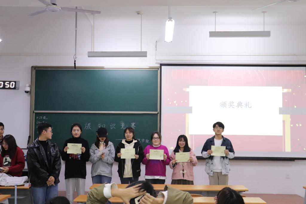 比赛开始,由民族事务部干事组织并宣布了比赛规则及比赛流程后,紧张激烈的比赛正式开始。按照赛前抽签顺序,各比赛队伍有序参加了比赛。共有12支队伍进入复赛环节。由于泽介绍复赛规则后,各队伍对题目展开激烈讨论,短短15分钟,展现出了同学们的才智与热情。接着在统计得分的过程中,进行了趣味性十足的中场游戏环节。各队参赛人员积极参加活动,现场氛围十分火爆,达到了此次活动的最燃时刻。经过统计人员统计,共有6支队伍进入最终决赛。六支队伍强强对决,分毫不让,彼此之间紧追不舍,最终经过激烈的角逐,20级劳动保障3班披荆斩棘,综合初赛与复赛得分,获得此次比赛第一名。
