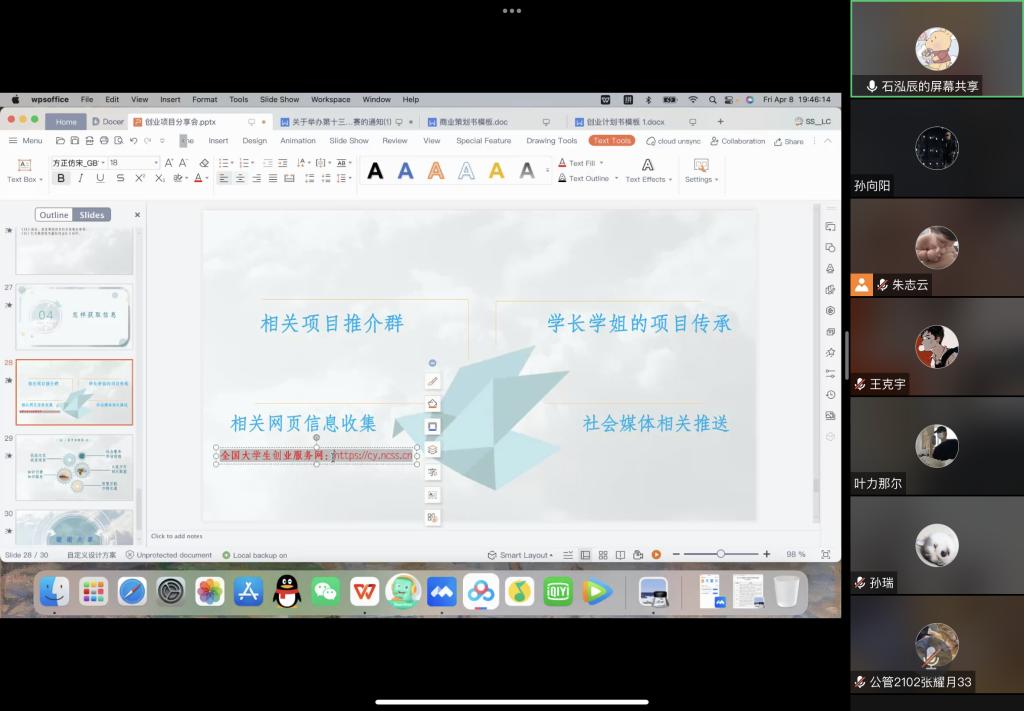 首先,石泓辰通过详尽丰富的PPT向我们分享了商创相关经验,从选择项目、实践项目、打磨项目、获得信息这四个方面,讲述了如何进行一场完整的创业比赛。其中详细介绍了第三部分,即如何打磨项目。她着重强调了互联网+、挑战杯、三创赛及各类商创项目创业计划书的“史诗级”通用模板,同时从执行概要、项目背景、产品技术与服务、市场分析、营销策略、公司管理、融资分析、财务分析、风险分析与控制、风险资本的退出这十个方面详细讲解了打磨项目的规范方法,给各位同学指明了一条清晰的创业路线。