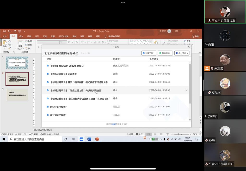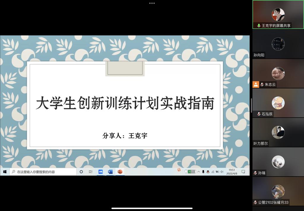 通过腾讯会议向全院本科学生召开国创分享交流会,会议由科创部部长朱志云主持,劳动与社会保障1901班石泓辰、王克宇主讲。