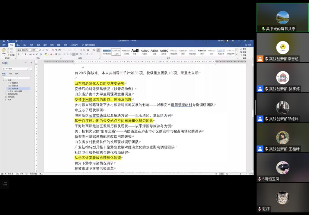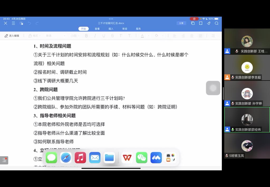 实践创新部通过腾讯会议成功举办“三千计划”答疑会,会议由2021级辅导员张辉主持,城市管理教研室教师吴书光与实践创新部副部长李吉超、邵经纬主讲,体育论坛