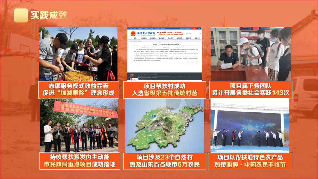 截至目前,项目成员志愿服务年度总时长已超过6000小时,承担地区重大志愿服务项目10余项、形成特色化思政实践成果6项、形成学术创新成果7项。团队成立了“乡村振兴齐鲁青年行”微公益平台,注册市级非企业社会组织(在审),并依托腾讯公益平台成立乐捐众筹微组织。