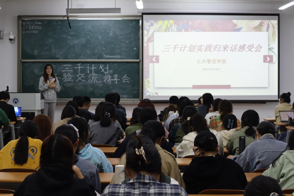 (通讯员 李星玥 杨政利 摄影 王步霓 刘珂瑜 何叶)为了让学院新生更好地了解“三千计划”社会实践活动,提升社会实践调研与撰写报告经验,10月30日晚,学院于圣井校区8-112教室召开了“三千计划”经验交流分享会。此次活动由学院实践创新部组织,三支重大团队分享,2023级全体同学参加。