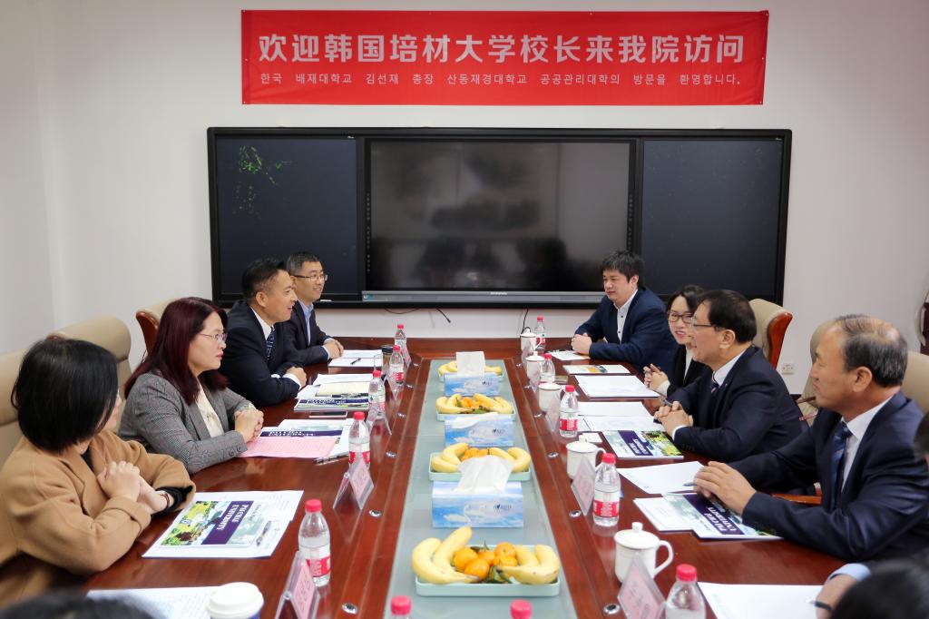 (MPA中心)对其一行的热情招待并就韩国培材大学的历史发展、院系构成、校园文化、对外交流、学生入学,学费奖学金等方面做了一一介绍。他表示,学校地处大田广域市,毗邻韩国行政首都,区位优势明显,交通方便快捷,学校以国际化办学为特色,与41个国家275所大学建立了姐妹关系近,具有50个国家700余名留学生,国际化程度高。希望双方能够建立稳固、长远、全面的合作关系。