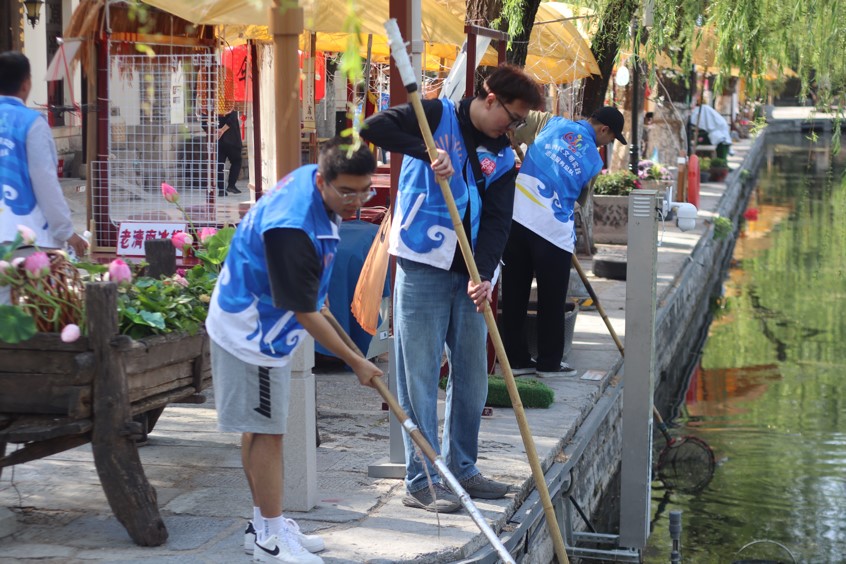“这里有垃圾”、“我们一起去拿工具收拾一下湖里的杂物”,有的同学认真捡拾景区内的垃圾,有的同学手持网兜,仔细打捞着河里的杂物。无论是纸片、塑料袋还是废弃的易拉罐,都被他们一一捡起、分类投放。参加志愿服务的同学们不怕脏、不怕累,认真细致地完成了每一项任务。