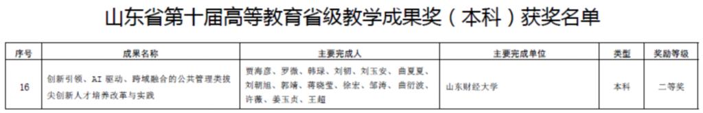院长贾海彦教授主持申报的成果——《创新引领、AI驱动、跨域融合的公共管理类拔尖创新人才培养改革与实践》荣获本科教学成果奖二等奖,充分展示了学院在深耕教育教学改革和探索人才培养数智化方面的创新性成果。
