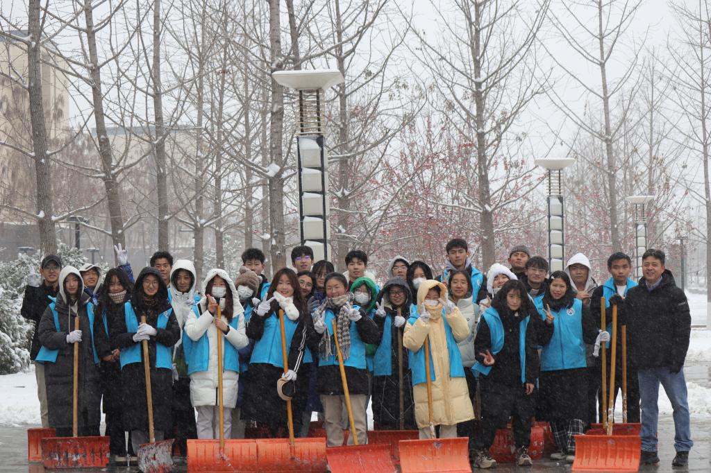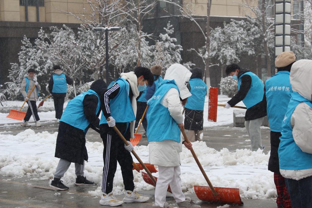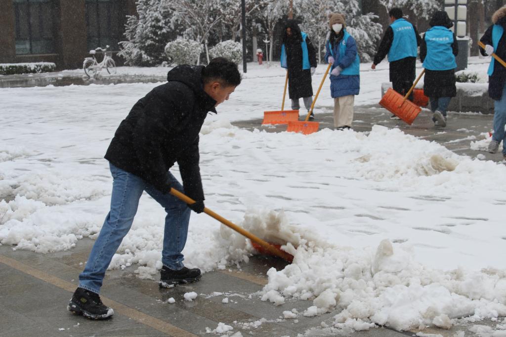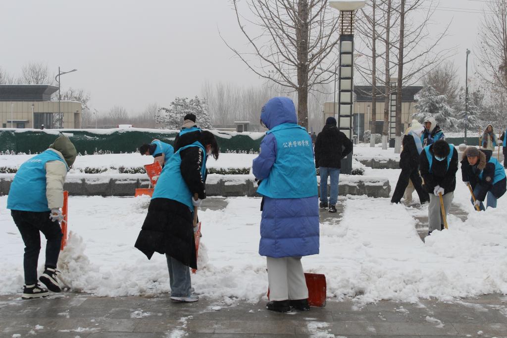 师生志愿者们于八号教学楼前广场准时集合,大家热情高涨,组织有序,分工明确,干劲十足。清扫路面上的每一片雪,铲除凝固的每一块冰,配合十分默契。每位志愿者都尽自己所能参与到扫雪活动中,团结一致,挥洒汗水,他们的志愿服务行为就像冬日的暖阳,温暖了整个校园。