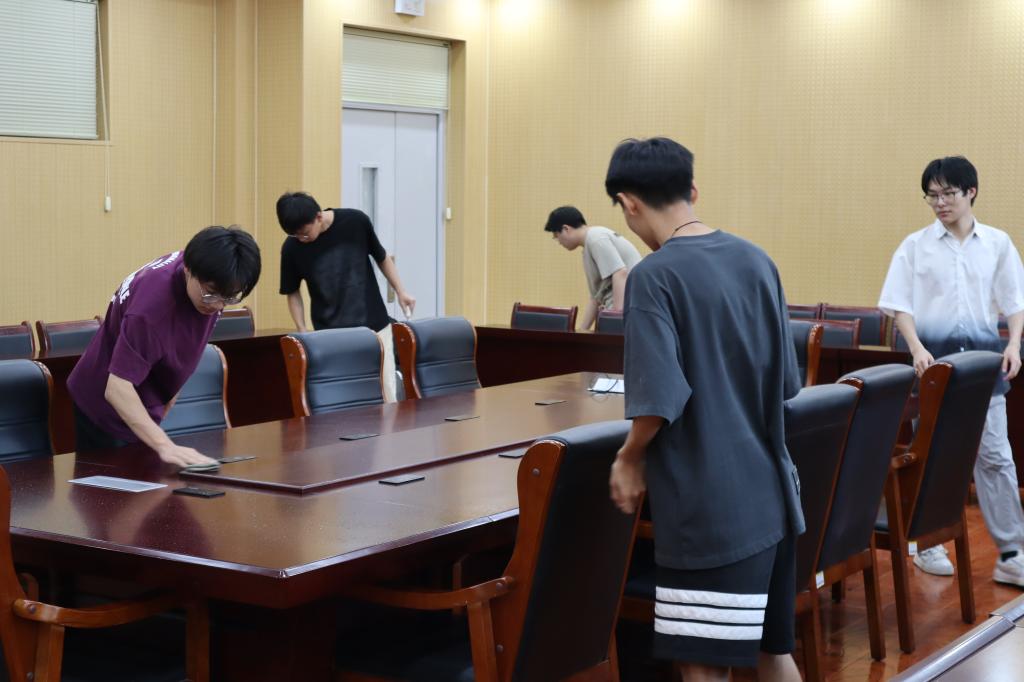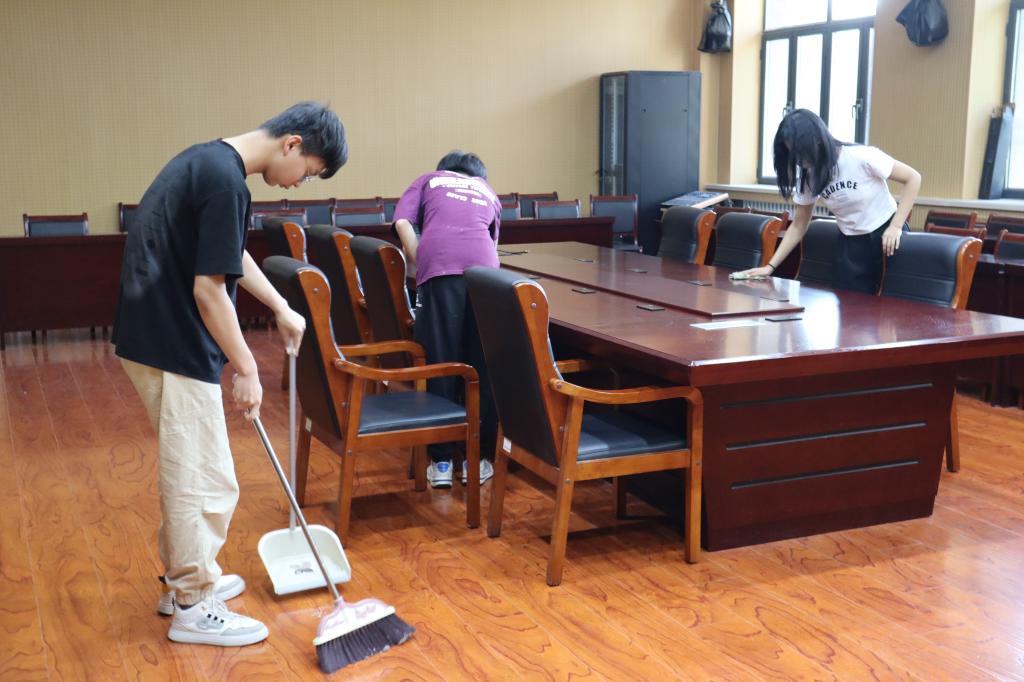 值日活动的区域是会议室和各个办公室,参与活动的学生们到齐之后就快速分工,在自己负责的区域认真打扫和整理起来。每位同学都手脚麻利、动作细致,一丝不苟地对待各个清扫环节。