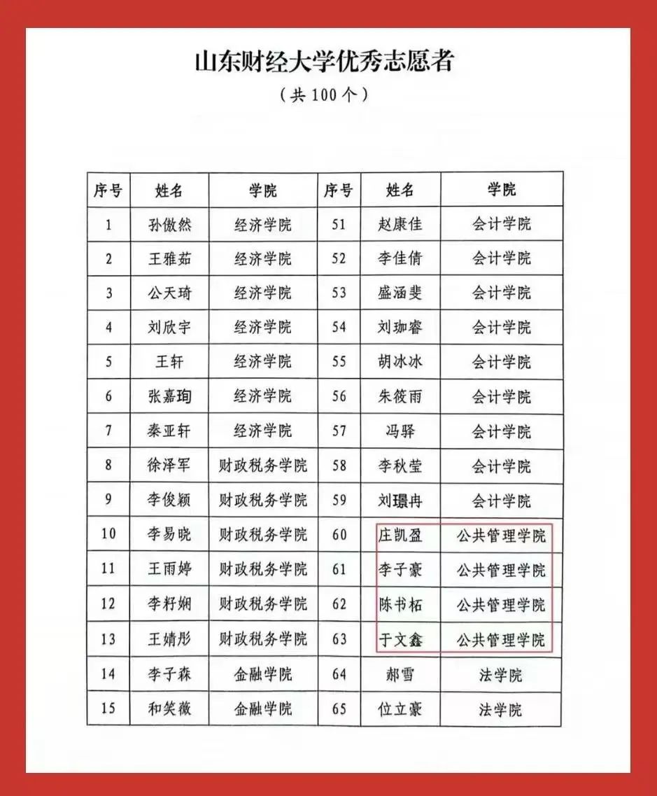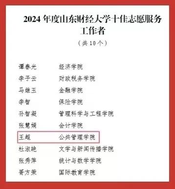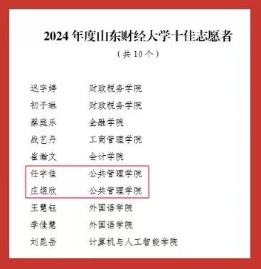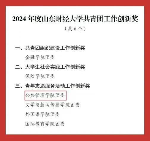 此次表彰中,学院团委荣获2024年度山东财经大学“红旗团委”“共青团工作创新奖”两大集体荣誉;2022级行政管理专业创新实验班团支部荣获学校“先进团支部”称号。个人荣誉方面,张海粟获评“财大最美青年”;任宇佳、庄煜欣获评学校“十佳志愿者”;王超获评学校“十佳志愿服务工作者”;庄凯盈等4名同学获评学校“优秀志愿者”。此外,40名师生获学校“优秀共青团干部”称号,96名学生获学校“优秀共青团员”称号,充分展现出公管学院青年群体昂扬向上的精神风貌。