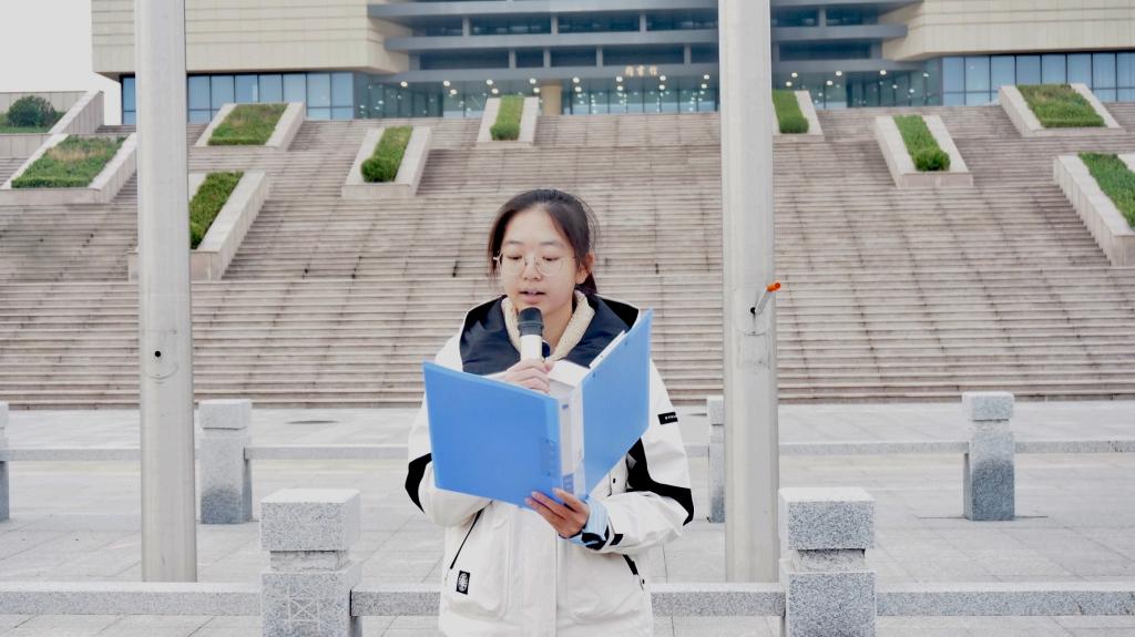 2025级公共管理类7班马心宇作为代表在国旗下发言。她激励同学们要时刻铭记国旗所代表的国家意志与民族梦想,将国旗精神内化于心、外化于行,以拼搏姿态砥砺前行,将个人的理想奋斗融入党和人民的共同奋斗之中。
