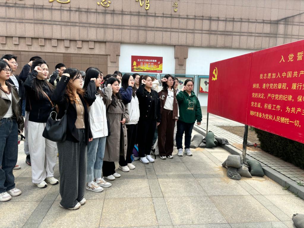 参观结束之后,全体党员整齐列队,面向鲜红的党旗,庄严地举起右手,重温入党誓词,牢记初心使命。